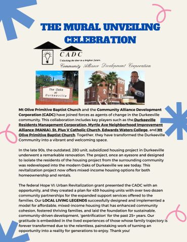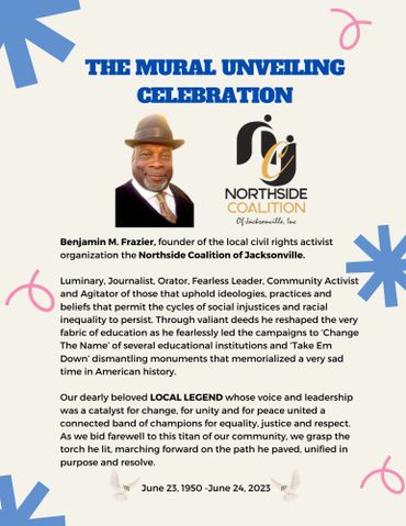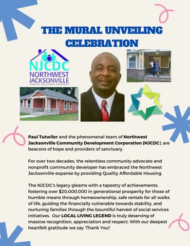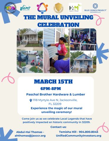 The mural celebrating Local Legends in the Durkeeville community will have its unveiling ceremony on March 15, 2024 from 6 to 8 pm at Paschal Brothers Hardware & Lumber: 1118 Myrtle Ave.